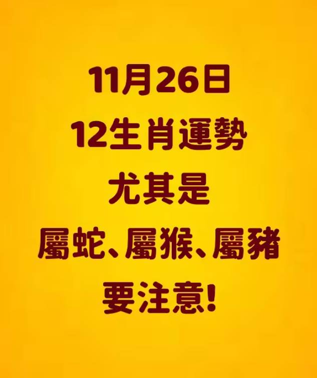 11月26日12生肖運勢 尤其是屬蛇、屬猴、屬豬要注意!鼠 (Rat): 友善比和。水汽強盛,是社交和合作的吉日。適合參加聚會、整合資源,在團隊中發揮重要作用。牛 (Ox): ? 財運最旺 (TOP 1): 亥水為您的強勁偏財星,財源滾滾而來。適合處理金融業務、投資或洽談高額訂單。虎 (Tiger): 六合逢印。亥寅六合,水生木為印,貴人運和學習運極佳。