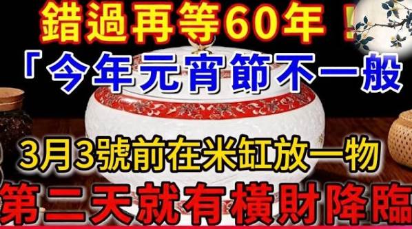 2026年3月3日,星期二,這一天不僅是農曆正月十五元宵節,更是60年一遇的丙午「赤馬年」中最重要的轉運日。命理專家指出,元宵節是「天官大帝」聖誕,也是一年中補財庫、求好運的絕佳時機。在這個關鍵時刻,只要在米缸裡放入「這一物」,就能啟動招財磁場,讓第二天就有好運降臨,即使過去再窮困,也能逆天改命,創造財運奇蹟。